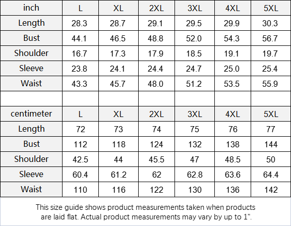 | inch | L | XL | 2XL | 3XL | 4XL | 5XL |