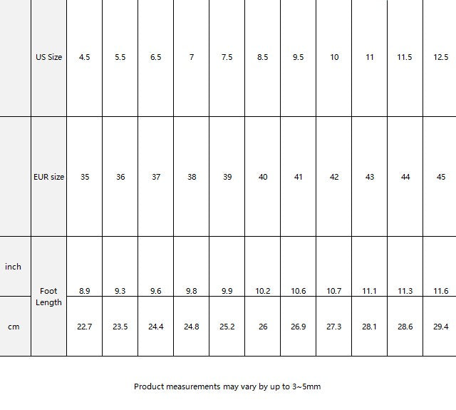 | US Size | 4.5 | 5.5 | 6.5 | 7 | 7.5 | 8.5 | 9.5 | 10 | 11 | 11.5 | 12.5 | |