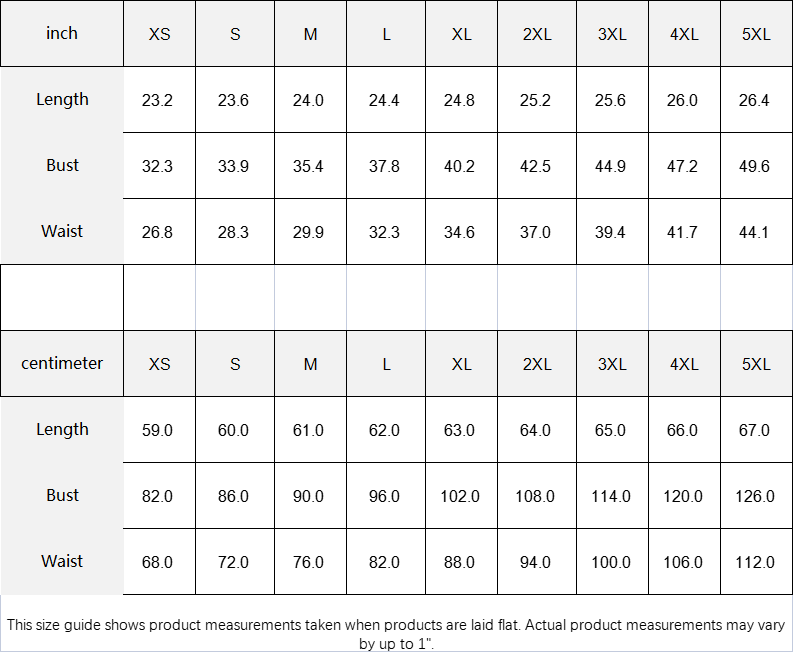 This size guide shows product measurements taken when products are laid flat. Actual product measurements may vary by up to 1".