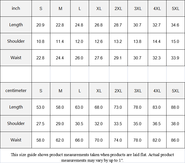 | centimeter | S | M | L | XL | 2XL | 3XL | 4XL | 5XL |