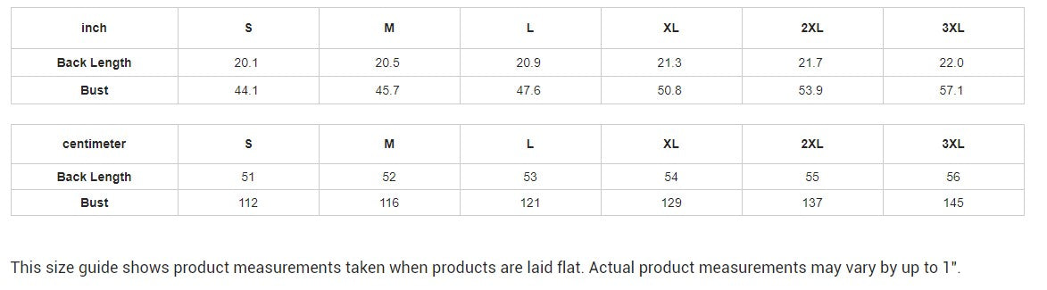 | Back Length | 20.1 | 20.5 | 20.9 | 21.3 | 21.7 | 22.0 |